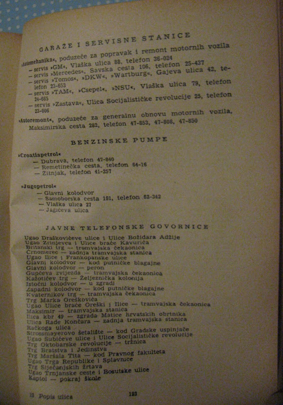 Zgodno je, recimo, pogledati koliko je auto servisa tad imao Zagreb i gdje su bili. Zatim, interesantna je i činjenica da je tad bilo 7 benzinskih pumpi (u vlasništvu "Croatiapetrola" i "Jugopetrola") od kojih su tek dvije još i sada aktivne, one u Jagićevoj i Dubravi (iako nisam sasvim siguran da se radilo o pumpi kod Dankovečke). Isto tako, u Zagrebu je bilo i 27 telefonskih govornica - nadam se da možete pročitati sitna slova i odgonetnuti lokacije!