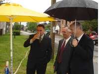 Moj dobar poznanik Đuro Anđelković (načelnik općine Davor) s guštom pije ovu čašu vode u društvu načelnika Općine Vrbje Stjepana Stipića i jednog od zamjenika župana Brodsko-posavske županije Zvonimira Lasla ( također mog poznanika, nekad tihog i mirnog, a sada eto uspješnog u lokalnoj političkoj sceni). Tijekom današnjeg dana u Bodovaljcima ( obližnjem selu u novogradiškoj posavini) je održana svečanost kom prigodom je označen službeni početak puštanja u rad cjevovoda, koji će iz pravca Davora pitkom vodom opskrbljivati pučanstvo Općine Vrbje i Rešetari, i šire područje zapadnog dijela Brodsko-posavske županije. Riječ je o oko preko 6 milijuna kuna vrijednoj kapitalnoj investiciji koja će imati presudan značaj za svekoliki razvoj spomenutog područja. Činjenica je da smo za „europske standarde“ mi poprilično zaostala sredina, jer eto tek sad gradimo vodovodnu i kanalizacijsku mrežu. Onda se pitamo zašto nema stranih investitora? Vjerojatno oni čekaju da izgradimo svu tu potrebnu infrastrukturu i onda im to ako je moguće ponudimo besplatno ili za male novce. Istini za volju i ovaj projekt je ostvaren dijelom zahvaljujući u zadnje vrijeme toliko razvikanim pred-pristupnim fondovima EU ( što bi mi šoci rekli to je valovac iz kojeg treba samo zagrabiti ili drugim riječima „bunar želja“). Bolje ikad nego nikad, rekli bi neki. Okupila se tu danas nekolicina uglednika, no ambijent je pokvarila kiša. Opet sam napravio grešku i na feštu otišao poslije ručka, tako da nisam ništa niti okusio s bogatog „slavonskog stola“(tko mi je kriv), a umjesto vode ipak sam popio nešto drugo ( da mi se žabe ne zalegu). Kažem ja Đuri: „Đuro, pada kiša, bit će vode u izobilju.“ On mi kaže: „Prijatelju, eno Sava se žuti i naglo raste, a ova voda nema veze sa Savom. Ona je iz ogromnog nalazišta iz dubina, i kažu da je ima za cijelu Županiju.“ Ja sam skeptičan prema toj vodi ( moj laički stav) jer se sjetim „kobaške bolesti“ i ljudi koji su baš zbog vode obolijevali od vrlo raritetne bolesti bubrega. Nekako više cijenim brdske izvore. Na kraju se opet šalimo na temu politike. Zezam ga i kažem: „Đuro imat ćete vrtić, i ceste i vodu, i što vam ono još treba?“(aludirajući na svojedobni boravak premjera Sanadera u Davoru, a kasnije su te riječi uspješno korištene u promidžbi HDZ-a Davora za lokalne izbore). Đuro se smješka i kaže: „Ako što „zašteka“, ja nazovem premijerovu tajnicu i samo pustim taj spot, i da vidiš, mora biti.“- dakako šali se Đuro.Ovaj lijepi događaj razvedrio mi je ovaj tmuran kišni dan. Danas je za mene sve u znaku vode. |