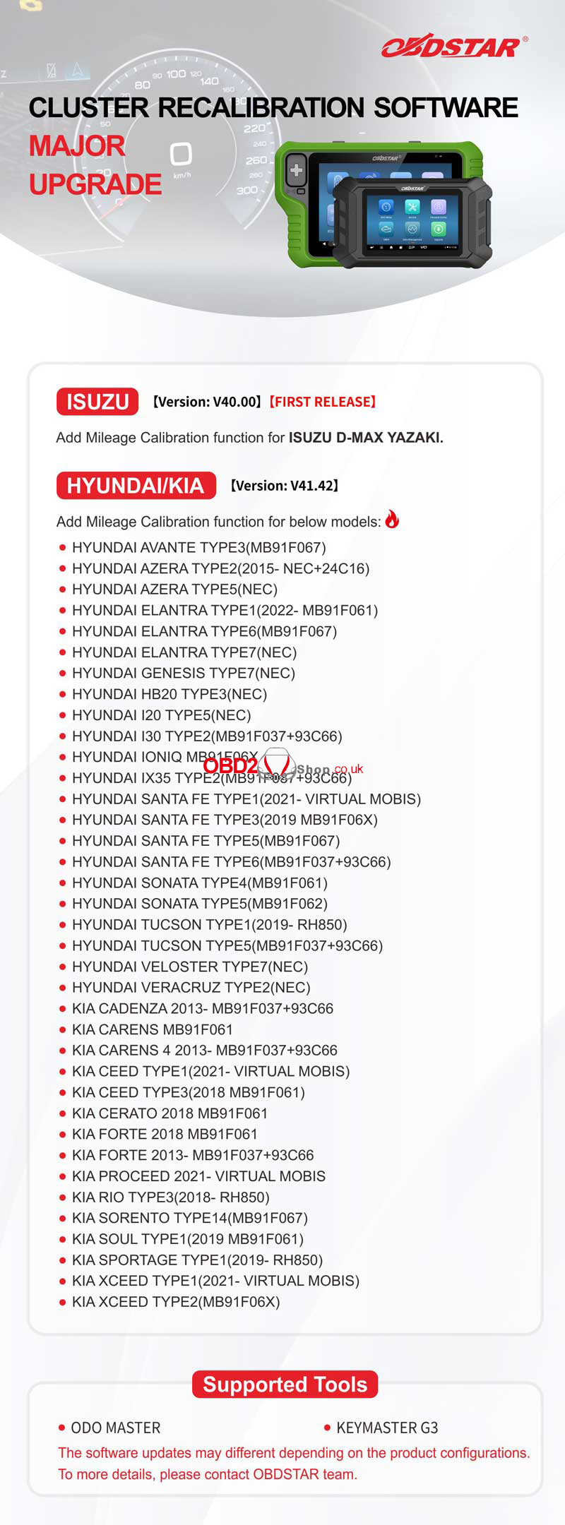 OBDSTAR has released ISUZU/HYUNDAI/KIA Cluster Recalibration Software Major Upgrade this month. Now it's available on OBDSTAR ODO Master&X300 Classic G3. Please update your device in time for the latest features.