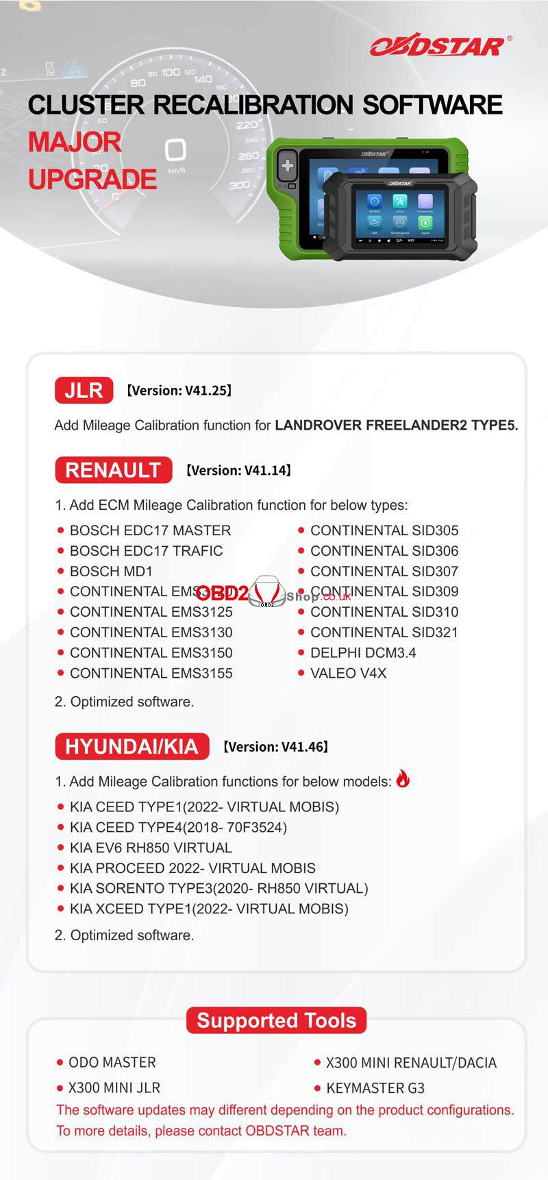 OBDSTAR has upgraded cluster recalibration software for JLR, Renault, and Hyundai/KIA. Now it's available on ODO Master, OBDSTAR X300 MINIRenault, X300 MINI JLR, and X300 Classic G3. Below are the upgraded details: