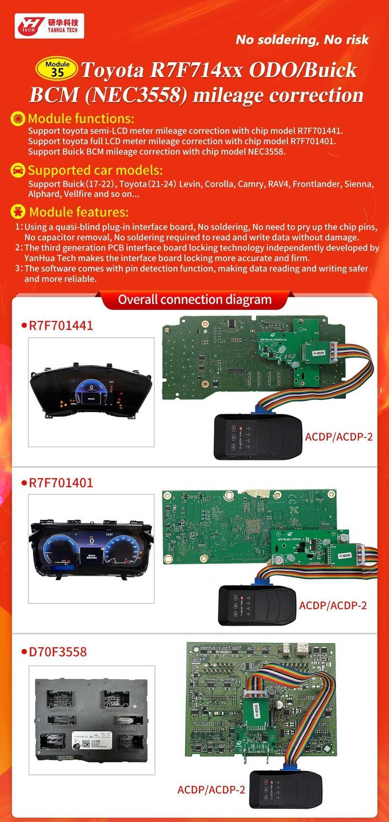 New release! Yanhua ACDP Module 35 is coming soon this month. It is used for correcting Toyota R7F714xx ODO/Buick BCM(NEC3558) mileage. It needs to work with the Mini ACDP 2 basic module.
