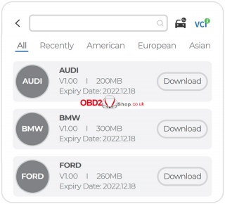 Software Updates: All downloaded vehicle-specific software packages are listed on the software download page within the APP. If a newer version of a software package becomes available, an "Update" button will appear next to it. Simply tap this button to update the software.
