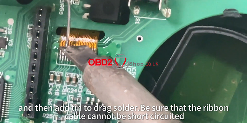Use a soldering iron to fix the ribbon cable in place, then apply tin to perform drag soldering.