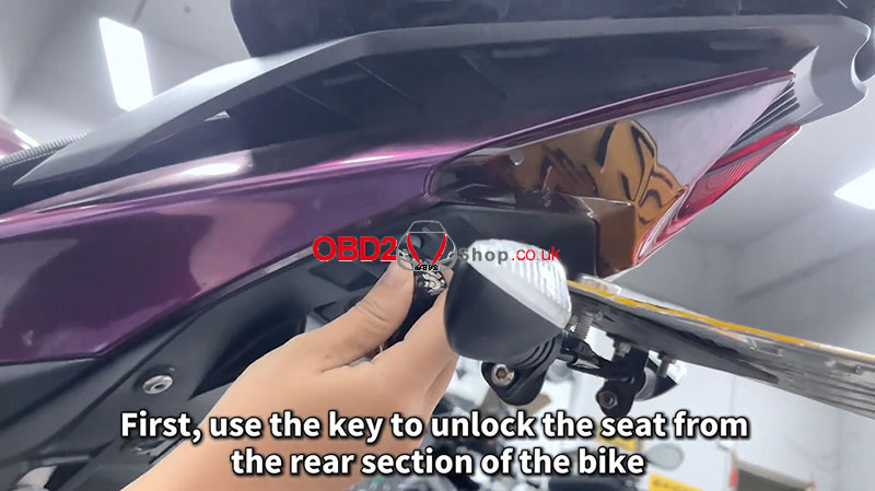 Use the ignition key to unlock and remove the seat from the rear section of the bike.