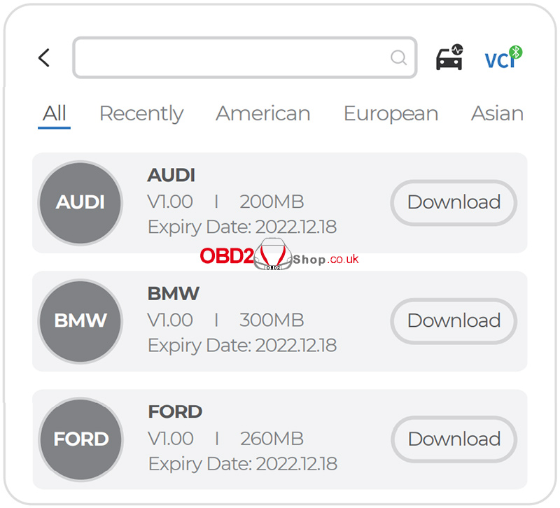 The first time you use the diagnostic function, you will need to download the specific software for your vehicle. From the APP's home screen, tap Vehicle Diagnosis and proceed to download the required software package.