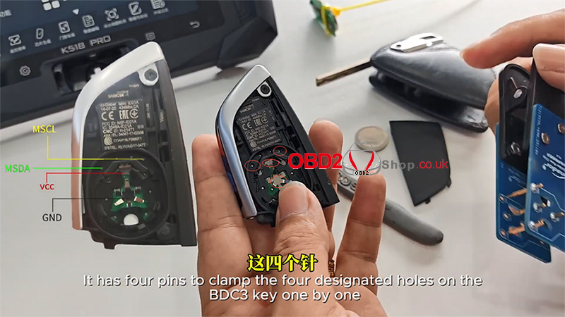 Carefully align these four pins with the four designated holes on the key. Once aligned, clamp the clip securely onto the BMW BDC3 keyboard.