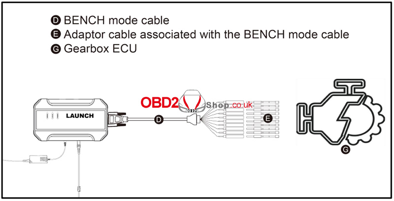 4. Refer to the wiring diagram and use the BENCH mode cable together with the appropriate adapter cable to connect the ECU to the Launch X431 ECU & TCU Programmer.