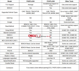 PSG16: PADFLASH uses BENCH, Foxflash uses OBD.