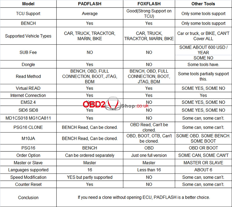 If you need a tool that allows cloning without opening the ECU, PADFLASH is a better choice due to its comprehensive support and flexibility. Foxflash excels in TCU support and offers a robust full version without the need for a dongle. Other tools vary widely in their capabilities and may require additional fees or have limited support.