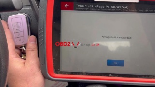 8. Keep the key touching the ignition switch and wait for the registration to complete. A "Key registration succeeded!" message will appear, updating the key counts (e.g., Registered: 3, Remaining: 4).