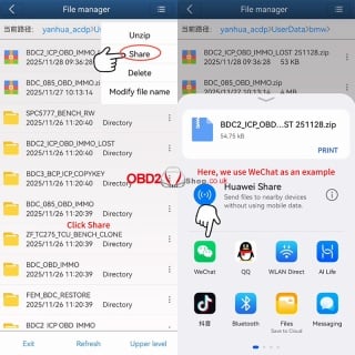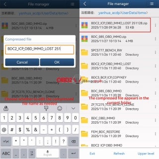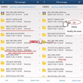 Locate the specific folder you wish to export (e.g., BDC2_ICP_OBD_IMMO). Tap the icon on the right side of that folder and select the [Zip] option from the menu.