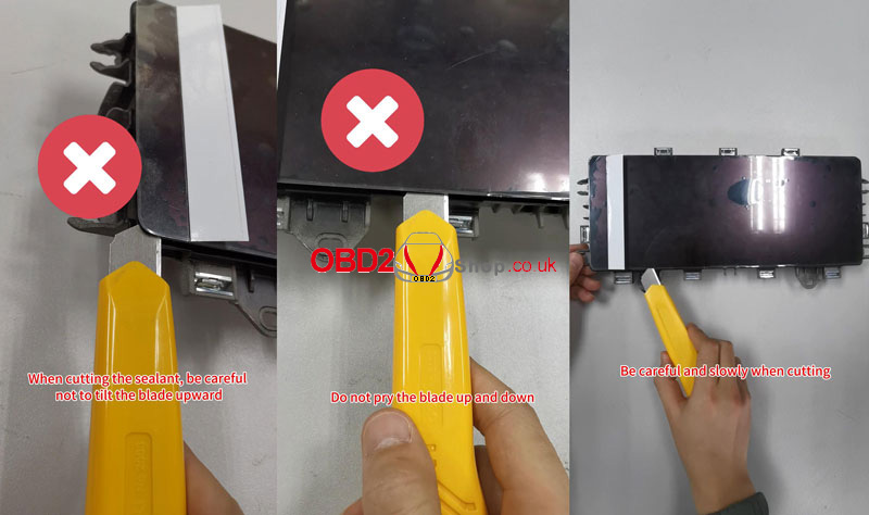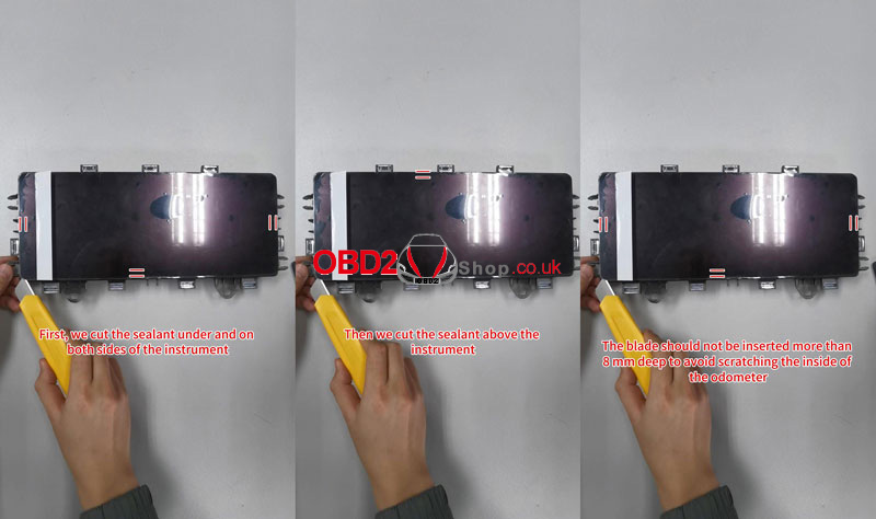 2) Cut the sealant under and on both sides of the instrument.