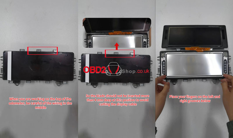 When you're working on the top of the odometer, be careful of the wiring in the middle. So the blade should not be inserted more than 4mm deep at this position to avoid cutting the display cable.