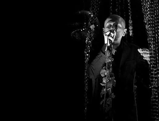 Nešto malo kasnije, i zavjese su spuštene. Publika je ostavljena da čeka, dok se po zvukovima tamo iza nešto ipak događalo. Mislim da je već bilo prošlo 23h kada su Urban i njegovi svirači izašli na netom otkrivenu pozornicu, ukrašenu nizom staklenih kugli koje su u sebi imale svijeće i visjele sa stropa, jednom velikom «disko kuglom», te svjetlucavom, uskom zavjesom od šljokica koja je stajala tik ispred Damirovog (sad smo već prešli na «on» ;) mikrofona.