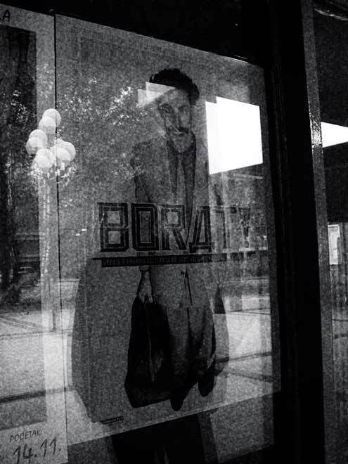"Borat" je primjer filmske fotografije, i studija novoizrasle ikone, uz zrnatost koja simulira visokoosjetljivi film radi postizanja živosti i pokreta, kad se već radi o plakatu kao prilično statičnom mediju.