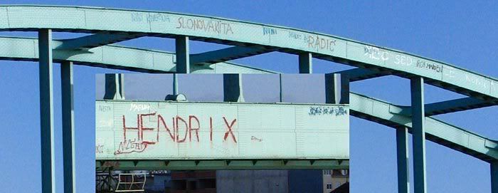 "Hendrix", uz intervenciju graffiti umjetnika iz neodređenog razdoblja (vjerojatno postavangarde), apelira na pojedince koji su se svojim djelovanjima i postignućima postavili na mostove čovječanstva.