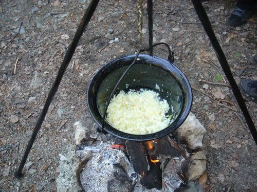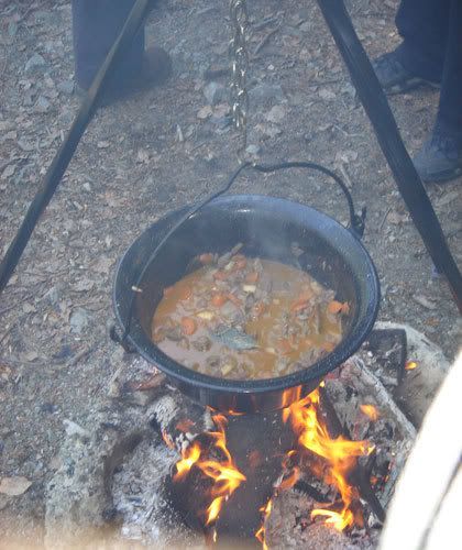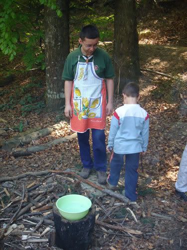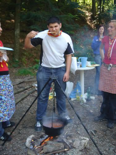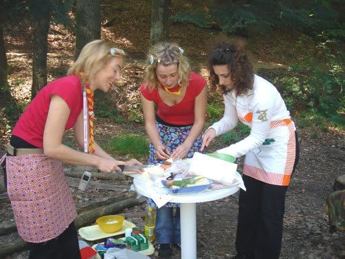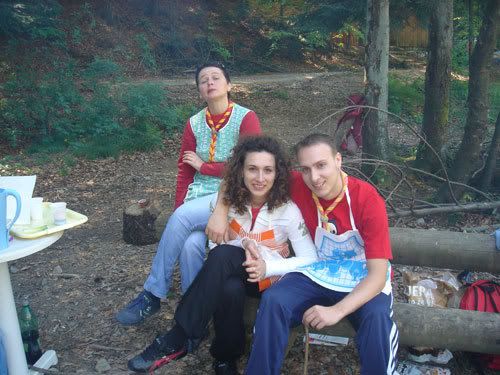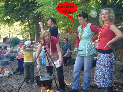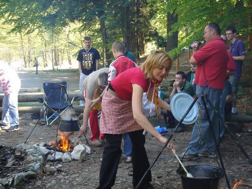 Pametnim dogovorom gotovo sve namirnice su bile kupljenje dan prije, osim krumpira kojeg se u Kauflandu moglo naći doslovce u tragovima... katastrofa... Nakon kavice na Krasici i obavljenog šopinga u obližnjem Brodokomercu (kad već reklamiram Kaufland, onda mogu i Brodokomerc...) i još nekih kratkih dogovora, zaputili smo se u brdo za Fužine... Već u autu je vladalo jako dobro raspoloženje, uz držanje gigantskog frizbija i ostalih stvari što smo imali... A onda je krenula panika - malo kasnimo, nismo se uredile... sad, sad, sad... I tako smo nabacile par viklera i fatalni crveni ruž... Vesna je to obavila dok smo čekale zeleno na semaforu... kao prava ženskica... U Rakovom jarku nas je dočekalo pojačanje - Sven i djevojka mu Ivana. Odmah nam se svidjela jer se bez problema bacila na rezanje kapule... još da je htjela ruž i viklere staviti... Dobro, njoj možemo oprostiti ipak joj je prvi put, ali Svenu baš i ne... Iako je MaxFactor bio blizu njegovih usnica, u zadnji trenutak je ustuknuo... Kvragu... Kotlić je svečano otvoren uz malu rakijicu koju je za naš klub odradila naša predsjednica... Ona se zna ponašati u tim protokolarnim situacijama... Onda smo počeli - brzo smo naložili vatru, i isjeckali kapulu, mrkvu i ostale korjenaste i slične proizvode što smo imali... Dok se kapula fino dinstala, Cilja je narezala meso (vidi sliku tjedna)... Dalje kako je išao postupak kuhanja i šta je sve u receptu nećemo otkrivati ovako javno.. koga zanima neka se javi u klub... Ali mogu vam reći da je prilično fino mirisalo, a i izgledalo. Iako su neki mislili nešto drugo... Svi su pomalo sudjelovali u kuhanju, a poklopac su imali jer nam je konkurencija bila blizu... Čak su slali male špijune zamaskirane u slatku dječicu. U neko doba su se počeli vraćati i kontrolori pa su neki odmah počeli pametovati... ali su nam i donesli cvijeće... Baš lijepo... Hvala vam puno... I tako je došao kraj kuhanju, a na red da komisija ocijeni koji je najbolji iako nama nije bilo svjedno kad je Boki došao probati... Cilja je bila u komisiji i ja nemam pojma koliko smo bodova dobili iz čega ali garant je stajling prevagnuo...