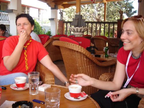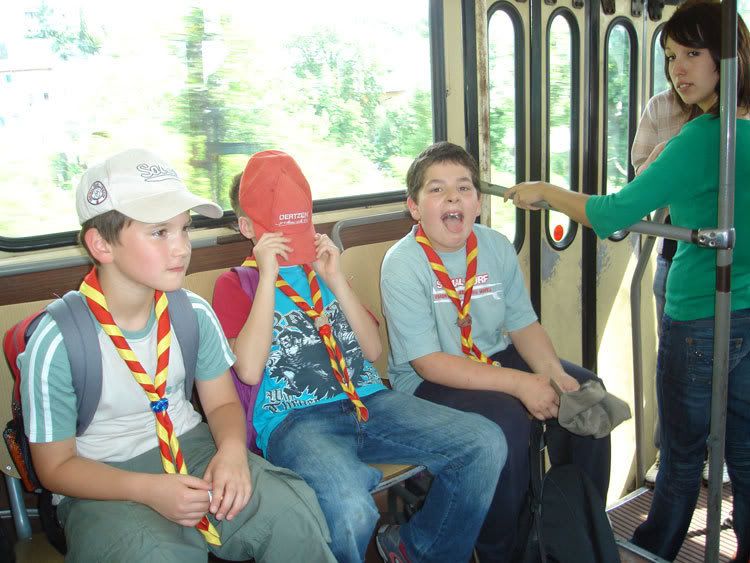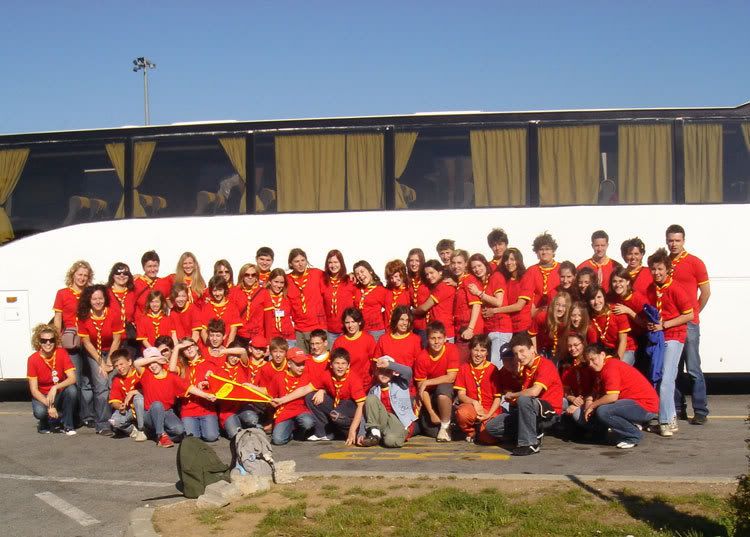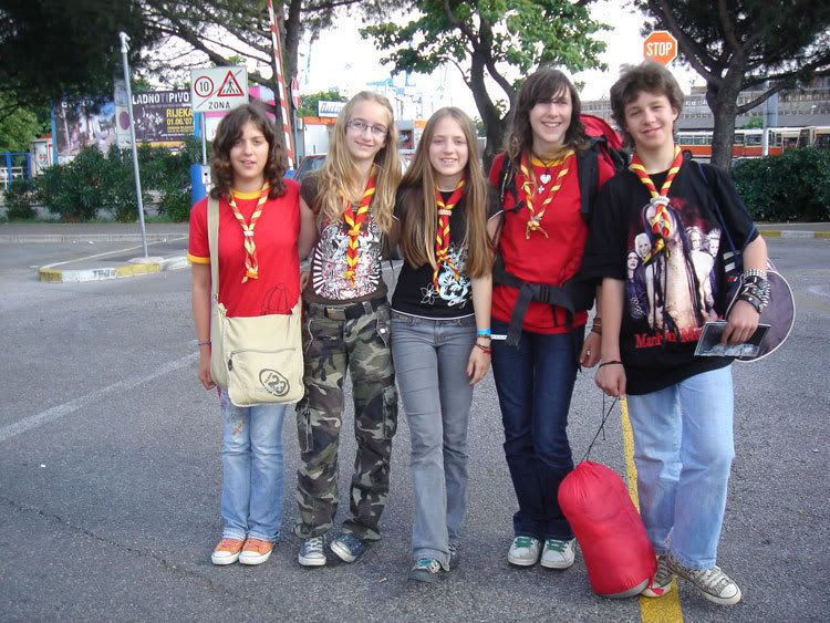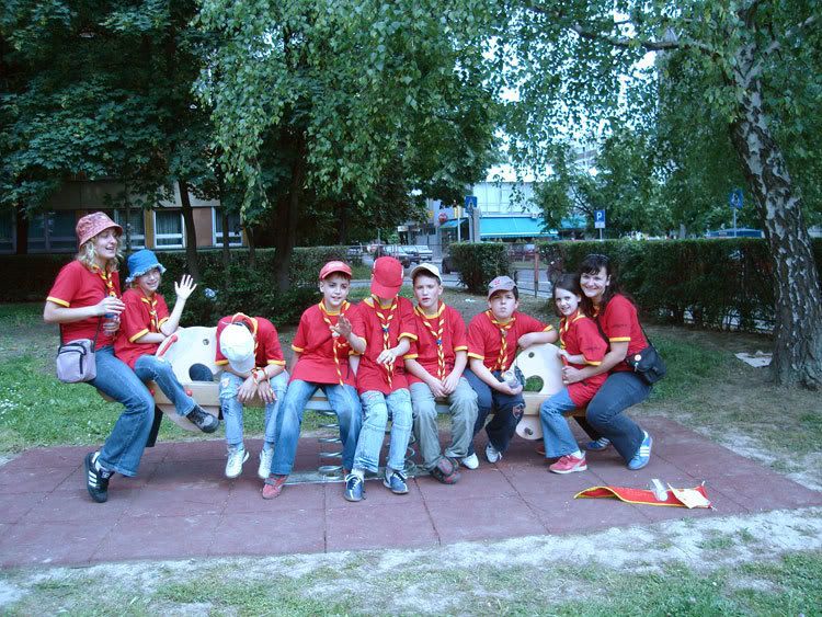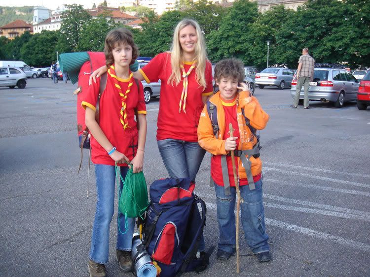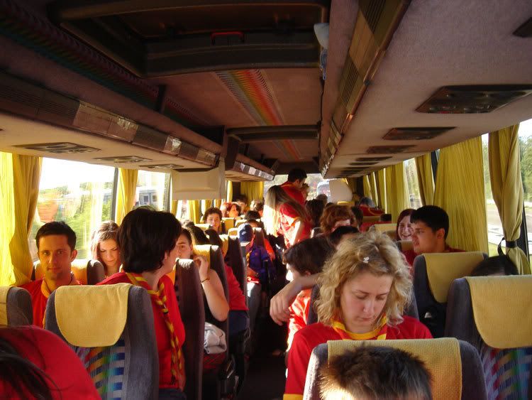 Dogovor starijih je bio naći se ranije na kavi - na nepoznatom mjestu u nepoznato vrijeme - a tko stigne zadnji zabavlja cijeli autobus na mikrofon... Naravno, znali smo svi vrlo dobro i gdje i kada (jer nema baš izbora u okolici Delte u 7 ujutro), a i onaj tko je stigao zadnji nije nakraju uzeo mikrofon - nego naša Maja (šifra: JUUUHUUU!!!) Krenuli smo sa zakašnjenjem od gotovo 15 minuta što nas je nakraju djelomično koštalo a time što smo propustili otvaranje (ali nije jedini razlog). Dragi moji koji kasnite, idući put vas NE čekamo - imate sreće što u odredu ima i dobrih dušica, jer ja sam htjela krenuti... U autobusu je na početku bila neka nj-nj atmosfera, koju su podigli Vesna i Vlado sa svojom trgovinom majicama, te Maja na mikrofonu. Do Tifona na Ravnoj gori svi su imali novu majicu pa smo i odmor iskoristili za kratki photosession.. Of course... Do Zagreba još dosta, a šole nikako da počne voziti - 80 po autoputu... svima je bilo jasno da ćemo zakasniti... a šta se tu može... Prije nego smo došli u Zagreb obavili smo još jednu vrlo važnu stvar u autobusu - Obećanje poletaraca koje su položili Ivana i Jakov i to na mikrofon! Čestitamo!!! I to baš na Dan izviđača - 19.05.