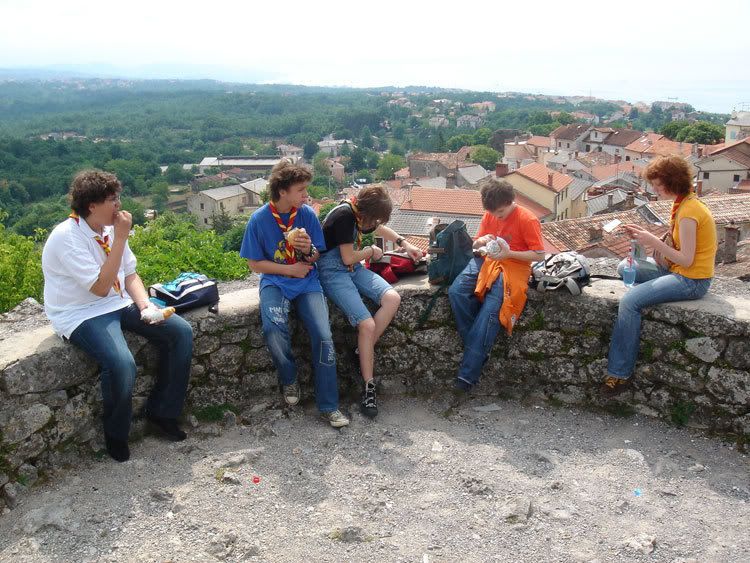 Grozno je to kad bi trebalo početi s nažalost... pa ipak neću tako početi jer ipak nije bila takva tragedija... Subota, prekrasan sunčan dan, sve nam je išlo u prilog... Jedino što je falilo su patrole... Došao je točno po jedan predstavnik iz svake patrole iz družine "Istra" i to - Plava munja - Evelin, Jednorog - Karlo, Bijeli tigrovi - Matko i Trn u oku - Mihael. Sanja G. koja ih je trebala dovesti na Kastav se iznenada razbolila - dobila temperaturu... Tako da je Željka ukrcala djecu u autobus, a ja sam im se pridružila 3 stanice prije Kastva. Od predvodnika je došla Eva direktno autom na Kastav. Zaključili smo da nećemo ići na šetnicu Zec , nego da ćemo sačekati poletarce te svi skupa otići na Puža ... U laganom obilasku Kastva i igranju prošlo je sat vremena kada su stigli poletarci... Mladi dabrovi - Jan, Andrej, Jakov, Ivana, Vana i Tena na čelu s Andrejom, te jato iz OIP Kantrida. Ispratila sam članove na stazu, dala im karte i dogovorili smo se gdje ćemo se naći. A Cilja, Željka i ja smo popile kavu i pokušale se odvesti do mjesta na kojem smo se trebali naći kako bi promovirali nove odredske majice... Izgleda da se svima jako svidjela šetnica, pa su se "zadržali" sat vremena dulje nego što je predviđeno... no mi smo ih čekale zabavljajući se uz svakakve glupave teme za razgovor... prave brđanske...