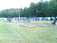 Tek malo pred našim terenom dotrčala je grupica Škota koji su nam pomogli sa stvarima i ponudili pomoć oko podizanja kampa - e to su izviđači! Kako svaka trupa koja broji četiri patrole dobiva označeni teren, a mi za sada još nismo znali tko će nam biti 4. patrola, pokušali smo podignuti kamp tako da ostavimo mjesta za tu Euroaziju... Već je lagano padao mrak i prijetila se neka kišica, ali smo uspješno sve postavili... Od kuhanja večere smo odustali, pa smo mazali putar i marmeladu... Opet dobro... Još malo dogovora i u krpe... sutra nas je čekao velik dan.. Otvaranje Jamboreeja...