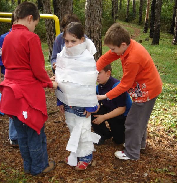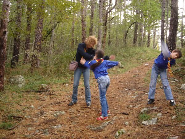 . Start i cilj su bili ispred škole u Kostreni, a kontrolke po trim stazi. Na prvoj smo igrali Skriči skreči (ali sa vješticama i duhovima)... zatim smo se popeli do početka trim staze gdje smo vezali čvorove ali smo morali trčati kao žabe i puzati kao zmije do špagica. Onda smo konačno krenuli po šumi gdje smo se malo glupirali izvodeći razne vježbe koje su zadane...