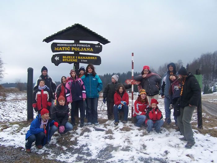 Tako je te subote ujutro složna skupina izviđača krenula sa delte komfornim autobusom prema Mrkoplju. I dok su neki malo stariji ubili oko na pola sata, ostali su čavrljajući skratili tih sat vremena puta. Nakon ugodnog dočeka rukovanjem svakog člana sa domarom Arsom predahnuli smo od dugog puta i bacili nešto pod zub. Nismo smo mogli dugo mirovati, sunce nas je kroz prozor uporno zvalo i šetnjica se morala nabacit. Odlučnim korakom povela nas je Cilja na put prema Matić poljani... Nije nam bilo lako, neki su morali odustati i vratiti se, ali usprkos snijegu, vjetru i daljini ostali su hrabro nastavili. Ovoga puta vodio nas je Orijan te nam skratio put dobrih kilometar, dva. A kad smo napokon stigli većina nas nije mogla izdržati a da se ne popne i osvoji pokoji spomenik partizanima. Uslijedilo je fotografiranje, par povijesnih činjenica koje nam je Luka iznjeo, jedan Alabio i trk natrag u dom na ručak koji se već hladio... (Ostali koji su odustali od Matić poljane su tražili zgodnu livadu s najviše snijega da se grudamo... i našli smo je. A onda je to izgledalo otprilike ovako: Bijeli tigrovi protiv Koke i polića... ostale cure su mudro ostale sastrane...) Ostatak dana usavršavali smo naše izviđačko znanje i vještine, igrali razno razne igre, saznali par najnovijih tračeva,... a večer je prošla uz zvuke najljepših glasova odreda, sa ludim koreografijama i twister turnirom... Te iste subote navečer obavile su se i dvije inicijacije. Mlade brđanke Petra Kandijaš i Sandra Arbula primljene su u klub brđana Veli Jože. Zadatak nije bio lak, isprva su bile :shocked:, ali su se uskoro uhvatile alata i bacile na posao. Rezultati nisu izostali: prva, prava i od snijega izrađena bista naše predsjednice kluba brđana Veli Jože - Ljiljane Cindrić. Ako malo bolje pogledate možda uočite razliku. Ni idućeg dana atmosfera nije splasnula zahvaljujući predvodnicima i njihovoj domišljatosti. Njihovi članovi, podijeljeni u četiri ekipe, imali su 30tak što zadataka, što pitanja. I tako dok su oni trčkarali gore, dole i oko doma, brđani su morali odgovarati na njihova pitanja, ali i raditi zvijezde, čučnjeve, nositi ih, igrati twister, i sve to ni više ni manje nego svakoj ekipi posebno! A kao završni zadatak ekipe su nas nasmijale svojim praščićima. Nakon razigranog jutra naši kuhari iznenadili su nas super ručkom, pohano i pire! A za desert smo se zasladili dobro nam znanim napolitankama ala struja. Vremena je bilo još taman za pospremiti dom, spakirati se, ispozirati za par odredskih fotki - Mladi dabrovi, Miješići, Bijeli tigrovi, Trn u oku, Juckelle i KB Veli Jože - i otpjevati Šuma, potok, dolina... Laganim truckanjem u autobusu vratili smo se našoj Rijeci. Odjeknuo je Alabio i bilo je vrijeme za kući poć... i tako je istih 34 izviđača sa početka priče otišlo doma, svojim obiteljima, prepirčavati još jedan nezaboravan izlet..