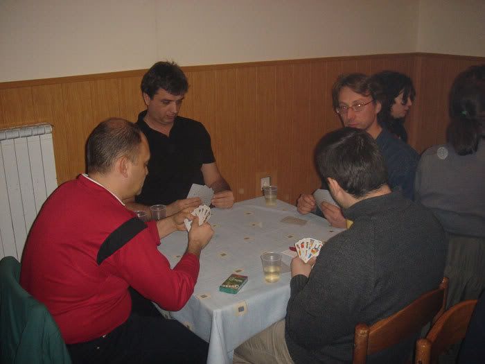 Oko 19 sati smo se pomalo počeli okupljati u Amfori. Zaključivši da je prisutna jedna polovica od svih 12 parova odlučeno je oko sistema po kojem će se igrati (nekakve skupine, pa samo jedan ide dalje, moraš dvije dobiti... i tako...) izvukli smo parove... U svakoj skupini po tri. Znači, morao si dobiti dvije partije za prolaz... Ne znam kako su prošli drugi, ali Đole i ja smo izvukli naše prošlogodišnje polufinalne suparnike Bojana i Slovana, te Žarka i Nina (čivavu