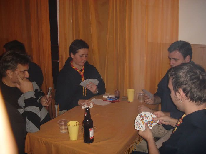 )... Uz svo poštovanje prema suparnicima (koji su stvano bili izvrsni) glatko smo prošli skupinu... U polufinalu su nas čekali Željko i Emil (neizviđači), prijatelji od Polića... Bilo je gusto i ja sam stvarno mislila da smo izgubili, a onda Đole zove napolu i tri trice u ključnom trenutku!!! Juhuuuu.... I onda finale. Za očekivati, u finale je ušao najčudniji i od moje ruke sklepan par - Vesna i Filac! Svi su se skupili oko našeg stola, nitko nije htio kući prije nego se sazna pobjednik... A na stolu kamara para, ladan probija znoj.... Dobro, nije bilo novaca... a nismo se baš ni znojili. Više smijali i zezali... I ne znam više ni kojim rezultatom (Vesna, jesi sačuvala?) pobijedili smo ĐOLE I JA!!!