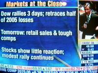 TRECI pozitivan dan sa velikim i pomalo neocekivanim usponom u DOW_J sa kojim smo KONACNO isplivali iznad razine pada ovog Utorka i dospjeli do novog vrha (PEAK-a) u 2005-toj! Trebao je doduse cijeli (skraceni) tjedan da se nadoknadi jedan los dan ali je Market konacno podignut na novu razinu tj na 2005-high za Dow_jones i S&P 500 (najvisa tocka ove godine).. Slijedeci tjedan dolaze novi brojevi (unimployment i ostali pokazatelji) u Market i vidjet cemo hoce li se ovaj run nastaviti ili ne..Sad se trejderi pitaju da li je bio vazniji kao putokaz, onaj PAD u utorak ili TRODNEVNI USPON ili je sve to samo «noice» tj sum u kretanju koji jos nije iscistio smjer (tzv TRADING RANGE gore-dolje).. Fed dize kamate i to nikad nije bas dobro za Market ali za sada simbioza radi. Inflation ili demand sta ce nadvladati, mnogi se pitaju?