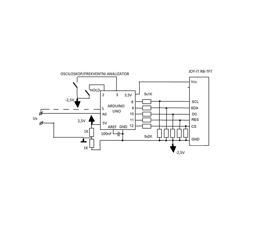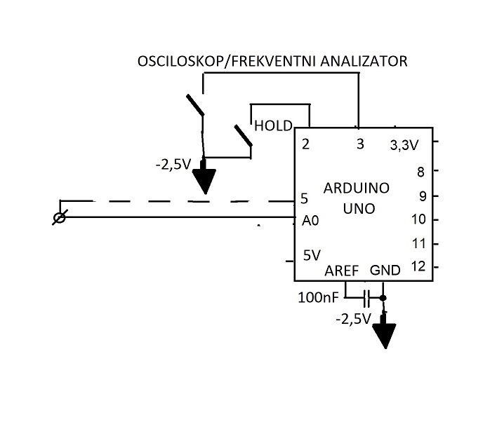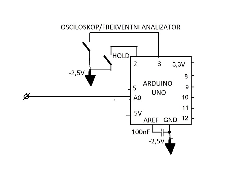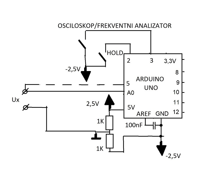 - pomoću naponskog djelila uobičajen raspon rada Arduina Uno (od 0 do 5V) "premješten" je, za potrebe mjerenja ulaznog izmjeničnog napona, na -2,5V do 2,5V;