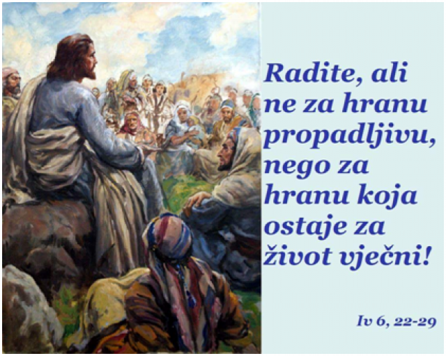 Isus, kada su pokušali raspustiti ljude, kaže: „Podajte im vi jesti!“ Papa Franjo kaže: „Gospodin nas tjera da hodamo tim putem, putem služenja, dijeljenja, davanja; i ako dijelimo, onda ono malo što imamo, ono malo što jesmo, postaje bogatstvo. Jer Božja snaga - a to je snaga ljubavi - dolazi do našeg siromaštva i preobražava ga.