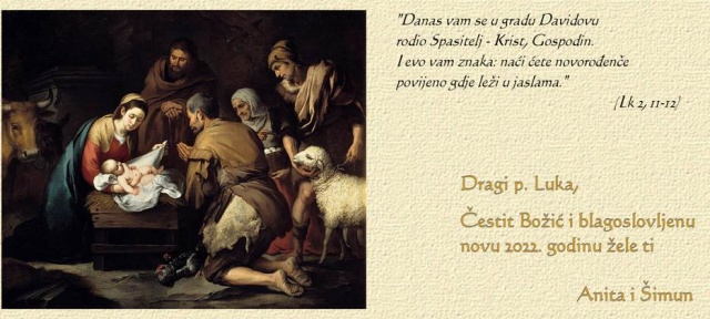 6.05 sati Hajmo u ovaj dan (srijeda, 29. 12. 2021.). A to je peti dan Božićne osmine. Evanđelje nam daje vidjeti širu obitelj dragog Isusa. Tu su starc Šimun, sutra će nam evanđelje predstaviti baku Anu. To je baš lijepo da je Isus Krist baštinio od njih toplinu njihovih srdaca i njihova životna iskustva. To mislim jer i moje srce je impregnirano iskustveno mudrošću Ogorske starčadi. Hajmo vedro i veselo naprijed. Vedrinom odsijevajući a to znači kroz sve događaje i susrete hvaliti i slaviti Isusa a Mariju primjereno častiti: HVALJEN ISUS I MARIJA. Haj, zdravi i veseli bili!