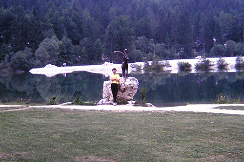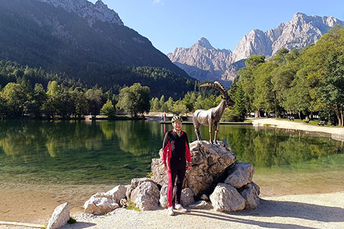 Nekih kilometar i pol od grada zastali smo na jezeru Jasna. Na wikipedii sam o njemu našao slijedeće: Jezero Jasna naziv je dvaju međusobno povezanih umjetnih jezera koja se nalaze u blizini Kranjske Gore uz cestu prema prijevoju Vršič. Jezera su uređena za potrebe turizma na ušću Male i Velike Pišnice. Uz jezero, osim apartmana, nalazi se i dječje igralište te brončani kip kozoroga na prirodnoj stijeni, koji je između 1986. i 1988. godine izradio kipar Stojan Batič. (kraj citata)
