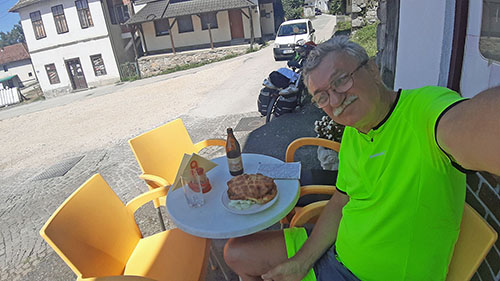 Vremenske prilike su mi danas nekako čudne do Doboja jutarnja svježina, čak i prohladna. No, nakon Doboja, kao da se sunce zastidjelo što je nekako pretjeralo s jutrošnjim dremežom, pa je pokušavalo to popraviti dodatnim grijanjem. Posljedica toga kod mene je znojenje, a to vuče za sobom češće zaustavljanje u hladovinama, i okrepa u obliku brisanja znoja i konzumacije pića (pogodite kojeg!)