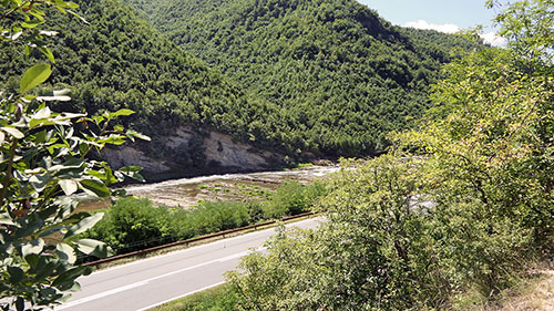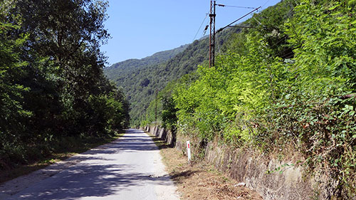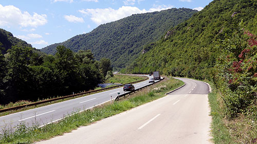 Uhvatio sam trenutak na gornjem snimku bez (veće) gužve prometala, pa se u potpunosti može osjetiti lepršavost osunčanog ljetnog jutra. Također se primjećuju brda koja su strmija i bliža nego ona što su bila jučer, a cesta se ovdje zbila uz željeznicu jer je iza nje već rijeka.