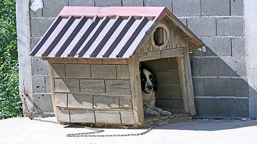 Sunce je dobrano grijalo pa sam mjesto za pauzu našao u hladovini lijevo od parkiranog Punta na gornjoj slici. Dok sam odmarao u hladovini grickajući breskve, pažnju mi privuče pas u kućici u susjednom dvorištu, kome se nije dalo izlaziti na sunce, već me samo motrio oštrim pogledom.