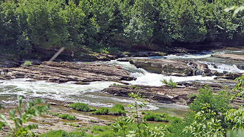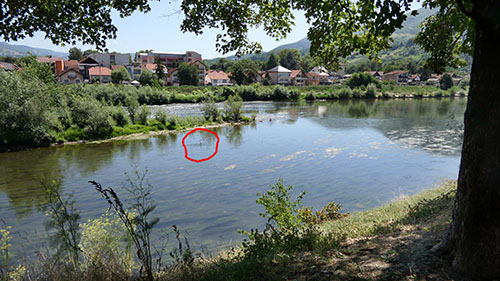 Dolje ispod mene vidi se željeznica, pa M17, zatim Bosna, te skoro okomita litica uz koju se provlači rijeka. Ovdje se nalaze Janjički slapovi na rijeci Bosni.