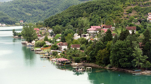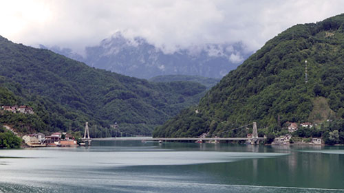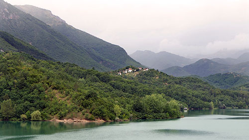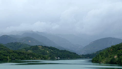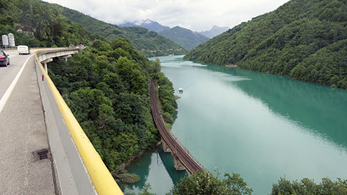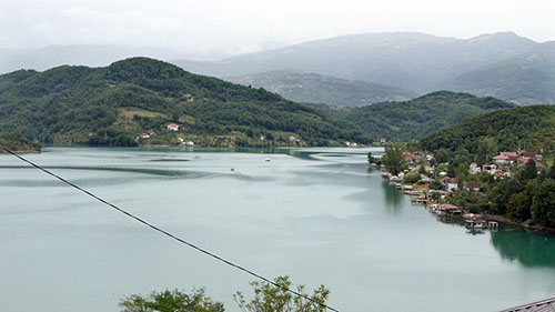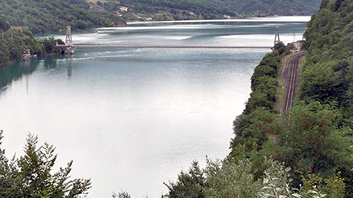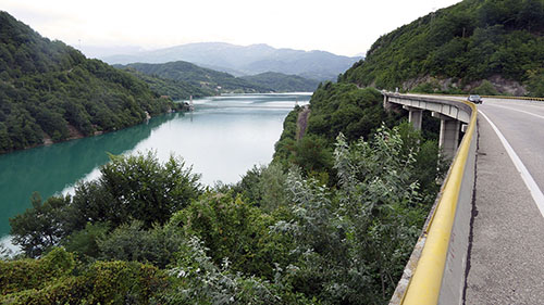 Magistrala kojom putujem nakon odvojka prema mostu je otišla uzbrdo. Na toj uzbrdici našao sam malo, ali dovoljno proširenje sa kojeg sam imao predivan pogled na jezero i okolicu ispod sebe, a da se ne sekiram hoće li me neki šleper zakvačiti. Prekrasan velim bez obzira što se tmurno vrijeme svojski trudilo da ga pokvari.