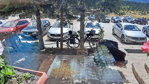 Bicikl sam parkirao uz prozor restorana, donio bateriju i punjač na šank gdje ih je ona ljepotica priključila na struju, a ja sam sjeo za slobodan stol kraj prozora. S druge strane tog prozora promatrao sam svog dvotočkaškog suputnika kako odmara u borovoj hladovini (znam da možda djeluje paranoično, no pobornik sam one izreke: „Na mom biciklu stalno mora biti jedna od tri stvari, ili moja guza, ili moja ruka, ili moj pogled!“).
