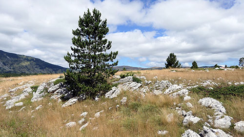 Ovaj bor-samotnjak mi je bio s desne strane, a s lijeve sam sreo naselje vikendica podno Čvrsnice.