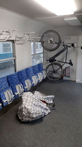 Radi lakšeg unosa bicikla preko „stepenica za nebo“ na ulazu u klasični vagon skinuo sam bateriju i sve ostalo što se moglo skinuti s bicikla.