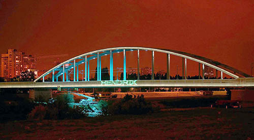 Grad Zagreb je, naime, javno most priznao kao Hendrixov. I to veoma izravno. Iz Grada su već u najavi otvorenja poručili da je “zahvaljujući grafitu most dobio kultni status i postao jednim od simbola urbane pop-kulture Zagreba”, iako se već godinama grafit briše, a građani ga nanovo pišu. Nije ni sada Grad, doduše, pristao na grafit, a i ne smije s obzirom na to da je most zaštićeno kulturno dobro. Doskočili su tome na drugi način pa su mimo dizajnera rasvjete koji su projektirali cijeli svjetlosni spektakl, odlučili iz jednog dvorišta uz nasip projicirati svjetlosni natpis “Hendrix“ na most. Također, za vrijeme otvaranja rasvjete, bend je svirao kultne Hendrixove hitove, a iz Grada su zaključili da je rasvjeta napravljena “baš u godini kada se obilježava 50. godišnjica Hendrixova prvog albuma te da se Zagreb prigodno na taj način pridružio obljetnici”. (tekst i donju sliku posudio sa vecernji.hr)