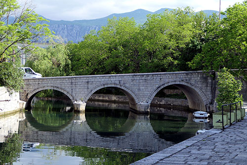 Kad se okrenem za 180 stupnjeva ispred sebe vidim kontinentalni dio potoka sa starim, kamenim mostom po kojemu ide cesta prema magistrali.