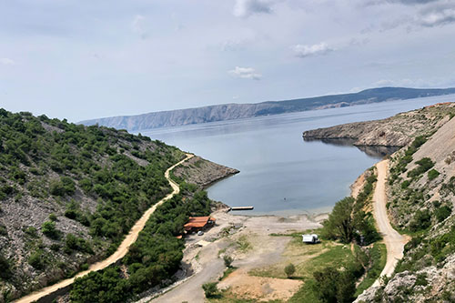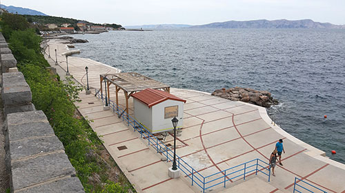 Oni nestrpljiviji pri odmaranju mogli su doći do kamenog zida i uživati u prekrasnom pogledu na kružni tok, već ranije spomenut i slikom prikazan, te na lučicu i more s otokom Krkom.