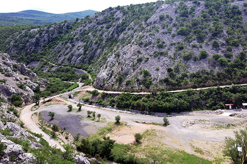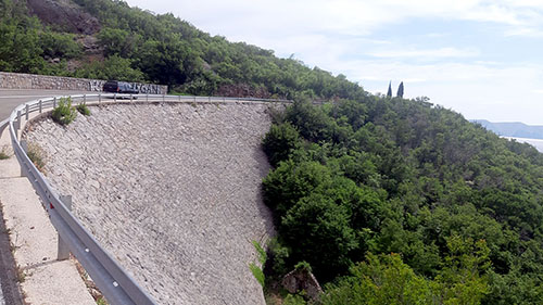 Sa lijeve strane odsječeno kamenito brdo, a s desne strane kameni burobran, ili klasični branik, koji cestu odvajaju od ponora prema moru.
