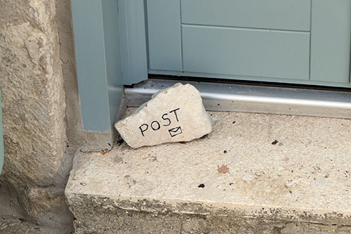 Svuda je tako velim, osim ovdje ispred ove stiješnjene kuće. Tu ulogu poštanskog sandučića igra jedan oveći kamen na čijoj je uglađenoj površini velikim slovima (velikim u smislu njihove mjere, kao i u smislu gramatičkog pravila (velika i mala slova)) ugravirano POST, kao sve prihvaćen pojam za poštu, ne samo u Engleskoj (čijeg je jezika i porijeklo napisanog izraza), nego u većem dijelu (zapadnog) svijeta. A za svaki slučaj, ako je poštar pripadnik (danas izuzetno male) populacije koji od Engleskog jezika ne zna ni E, a kamo li pojam „POST“ tu je ispod natpisa nacrtano malo pisamce, tako da će i takvom poštaru biti jasno da poštu treba – staviti ispod kamena.