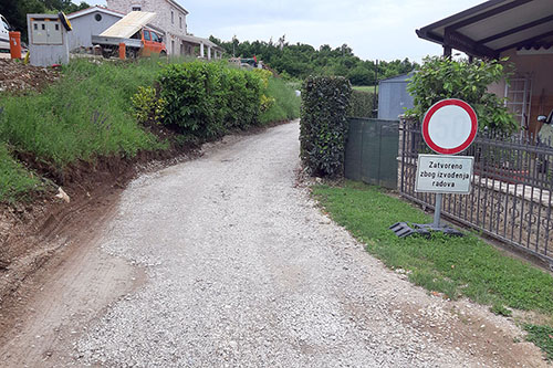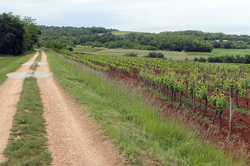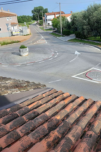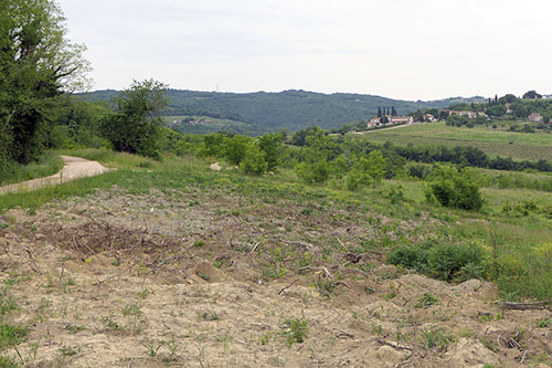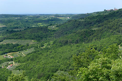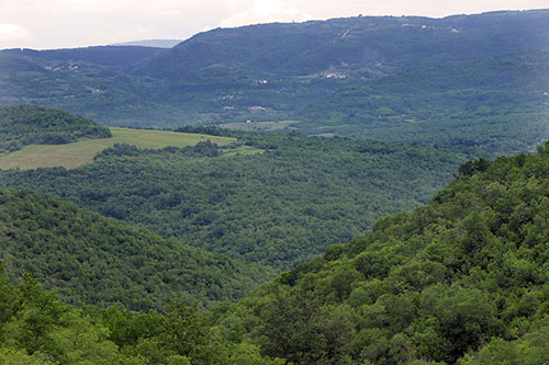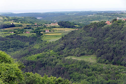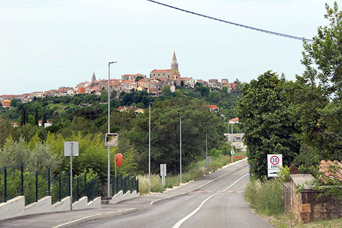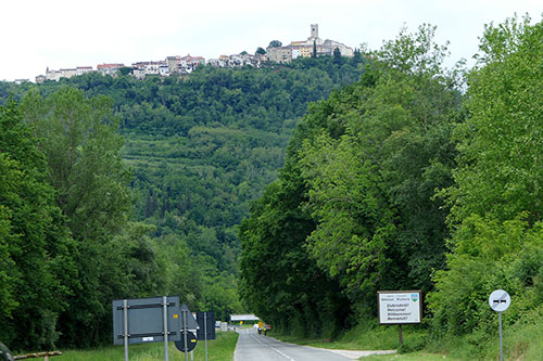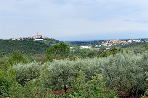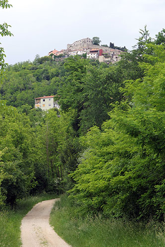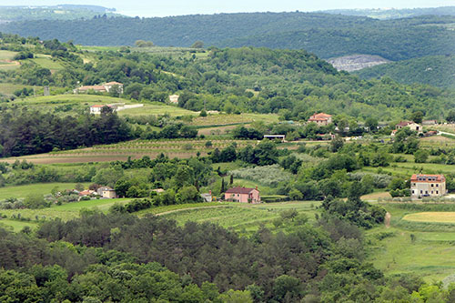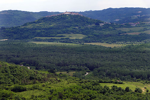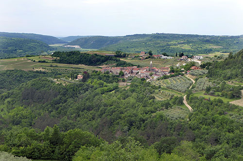 Tandrkali smo se neko vrijeme makadamom (ipak mi je asfalt bolji). Oko nas gusto zelenilo, pa je vožnja poprimila prve znake monotonije. No, tada se zelenilo povuklo i ispred nas prosuli vidik tipičan za unutrašnjost Iste, pa navedena monotonija satrvena i prije nego se značajno razvila. Brežuljkast teren bujnog zelenila, a neka od njih su dodatno uljepšana naseljem na nekim od vrhova. Tako je bilo i sa Bujama koje smo već vidjeli, istina s druge strane.