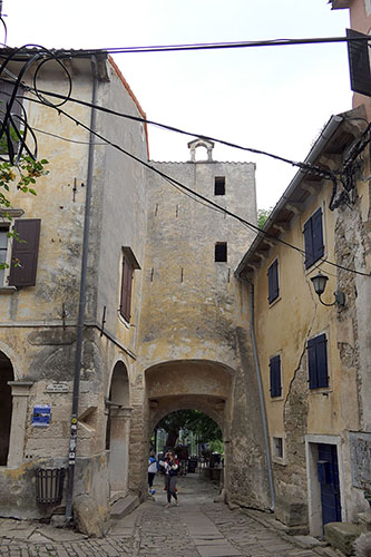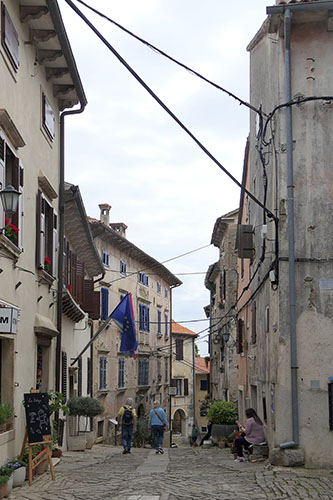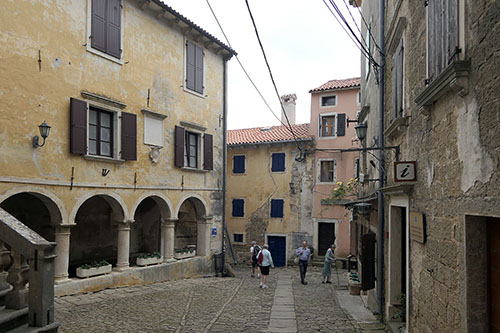 Gledajući gornji snimak, s lijeve strane je, recimo tako, centar mjesta, dok je desna strana trga omeđena širokom kamenom ogradom, jer je iza nje duboki ambis. Ako ne gledamo u taj ambis, nego malo podignemo pogled ispred nas će se prosuti prekrasni zeleni krajolik unutrašnjosti Istre.