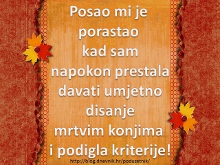 Ja kao sponzor pokušavala sam se nametnuti kao mentor i doslovno tjerati mrtve konje u utrku! A oni su samo htjeli biti mrtvi! Iscrpila sam sebe, a njima je bilo super jer su se hranili mojim znanjem, energijom, pozitivom, idejama. I da su barem nešto od toga iskoristili - ne - sve je ostalo samo na sanjarenjima.