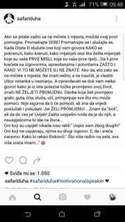 četvrtak , 25.06.2020. Danas ću vam reći nešto o sebi. Tekst ću posvetiti jednom komentaru koji sam danas pročitala na jednom svom tekstu i odlučila sam napisati nešto o tome. Mislim da ako već čitate moje tekstove i ako u njima pokušavam dijeliti savjete i potaknuti vas da poboljšate svoj život, imate pravo znati nešto i o meni. U komentaru ste me pitali o kome ja točno pišem, o sebi ili o drugima. Rekli ste da moji tekstovi imaju savjetodavni, a ne iskustveni pečat i ja moram reći da je to istina. Djelomično. Moji tekstovi stvarno imaju savjetodavni pečat i ja mislim da u tome nema ništa loše, naprotiv mislim da možda nekome mogu pomoći. Neće se svidjeti svakome i nije to moja namjera. Moja želja je da pomognu nekome. Jednoj osobi i ja ću biti zadovoljna i osjećati ću se uspješno. Ako samo jednoj osobi pomognu, ako jedna osoba osjeti optimizam i pozitivu, ako osjeti da može ostvariti svoje snove ili poboljšati svoj život, ako ju motiviram u pravom smjeru, ja sam taj dan uspjela. Pišem o sebi i želim ljudima na svom vlastitom primjeru pokazati da se može promijeniti. Iz negativne u pozitivnu osobu. Ja nisam osoba koja je oduvijek jako vesela i pozitivna, kojoj sve ide od ruke i koja se sad ovdje našla pričati gluposti ljudima. Ja sam osoba koja je bila jako nesigurna u sebe, nije vjerovala da može uspjeti u bilo čemu, uvijek brinula oko sitnica, bila okružena pogrešnim ljudima, uvijek širila negativu i nervozu. Ako sam iz te osobe uspjela postati pozitivna osoba koja će uvijek saslušati drugoga i barem probati dati neki razuman savjet, širiti pozitivu i veselje, želim pomoći još nekome da uspije u tome. Ima mnogo ljudi koji su u duši veseli i vedri, ali su okruženi negativom i ne znaju se izboriti sa time. Moram se složiti sa vama da život nije bajka i da je ponekad jako teška borba, nekome je život lagan a nekome je stvarno velika borba. Ja ne pričam ovdje o ljudima koji su doživjeli neku veliku tragediju, bolest ili smrt bližnjeg. Iako i takvim ljudima treba doza optimizma, ali ne bih si dala za pravo da govorim o takvim teškim životnim situacijama. Ako ste pročitali moje tekstove vidjeli ste da ja govorim o mladim ljudima koji imaju sve. Imaju obitelj, dom, prijatelje. Imaju mnogo više nego njihovi vršnjaci, ali oni pate za nečim što ne mogu imati i onda kada to dobiju pate za nečim drugim i tako u krug. Pričam o tome kako mlada osoba koja ima sve za sreću i kojoj život tek počinje govori kako njen život nema smisao i kako ne želi više živjeti. Mislim da je to ozbiljan problem našeg društva. Vjerujem da ćete se složiti sa mnom da stvarno nije realno da osoba koja ima sve i nikada nije doživjela neku tragediju u životu govori da ne želi više živjeti. Koliko slučaja samoubojstva se događalo? Koliko mladih ljudi je sebi oduzelo život? Ja mislim da se takvi problemi i takva razmišljanja mladih ne bi smjela ignorirati. Baš iz tog razloga želim ovdje potaknuti mlade i dati im motivaciju da mogu poboljšati svoj život, da nisu zarobljeni niti zaglavili na jednoj mjestu, da stignu sve i da ne trebaju sve shvaćati preozbiljno. Baš zbog toga želim dati savjete mladim ljudima kako da cijene svoje zdravlje, udalje se od ljudi koji im crpe energiju i okruže se pozitivnim ljudima. Dakle, pišem o sebi jer želim podijeliti kako sam iz nervozne i negativne osobe prešla u pozitivnu, vedru i veselu osobu koja želi pomoći i drugima koji to žele. Krenula sam s ovim tekstovima baš iz te namjere da budu savjetodavni i da svatko tko želi raditi na sebi i tko želi imati motivaciju može doći ovdje, pročitati i osjećati se motivirano. Svuda oko nas možemo naići na loše vijesti ili na to kako se ljudi žale na sve i to je u redu, mladi ljudi trebaju biti svjesni svega što se događa, ne trebaju živjeti u nekoj svojoj bajci u glavi, ali ne trebaju cijele dane čitati samo loše stvari i ne treba im se usaditi u glavu kako je život loš i težak, kako nemaju izbora i kako moraju živjeti tako kako žive. Svatko ima pravo izbora i može se potruditi za sebe i svoj život. Naravno da ima raznih priča ljudi kojima su se stvarno događale razne tragedije i da ja ne pričam o njima niti želim reći da je život uvijek i svima bajka, jer nije nažalost. No vjerujem da su svi toga već svjesni i da svijetu treba optimizma, posebno ljudima koji tek počinju ovu avanturu koju zovemo životom i koji stvarno imaju priliku od svoga života napraviti jednu predivnu priču i kojima život ne mora biti teška borba. Borba je svaki dan, ako odlučite pokrenuti nešto uvijek ćete se naći s ljudima kojima se to neće nimalo svidjeti i vi se uvijek na neki način morate izboriti za sebe, ali jedno što je važno je da se ne predate i da nastavite. O tome sam i pisala u jednom od tekstova, kako mnogo ljudi ima snove i potencijale da ih ostvari, ali se to ne događa jer se boje tuđih mišljenja i kritika. Kritike uvijek dobro dođu, ja sam i ovu kritiku uzela u obzir i odlučila napisati tekst na temelju nje i jako sam vam zahvalna na komentaru i vašem mišljenju. Moj cilj je dati savjet jer nekome stvarno može dobro doći i da potaknem ljude na optimizam i da se trude imati svoj pozitivan stav. Te borbe nisu ništa s obzirom na to koliki uspjeh možete napraviti i koliko možete napredovati. Zato ljudi živite život i ne odustajte. Nemojte biti jedni od onih koji smatraju da su zaglavili i da nemaju izbora. Ana Bučević i njene knjige su odlične i ja vam svakako preporučujem da čitate, no moj cilj nije pričati to što priča ona ili netko drugi nego jednostavno iznijeti svoje mišljenje i savjete. Uvijek dam za primjer neki citat ili tekst kao što ste već vidjeli, jer nekako mislim da su oni odlični kao motivacija i meni su pomogli, a vjerujem da puno ljudi nije pročitalo te citate niti ništa od Ane Bučević tako da ne vidim ništa loše ni u tome da podijelim s vama te stvari i da neki ljudi saznaju i 